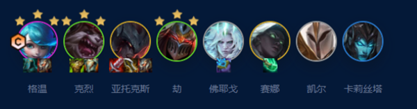 5、在4-1或4-2阶段升到7级,这是关键的转型期,需要大搜一波,目标是找到至少一张格温以及剑魔、劫等体系卡,替换掉打工仔,初步组成4裁决2暗影岛2潜行等羁绊。